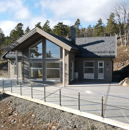 En populær hytte på stor og usjenert tomt. Stor terrasse med eksklusivt glassrekkverk!